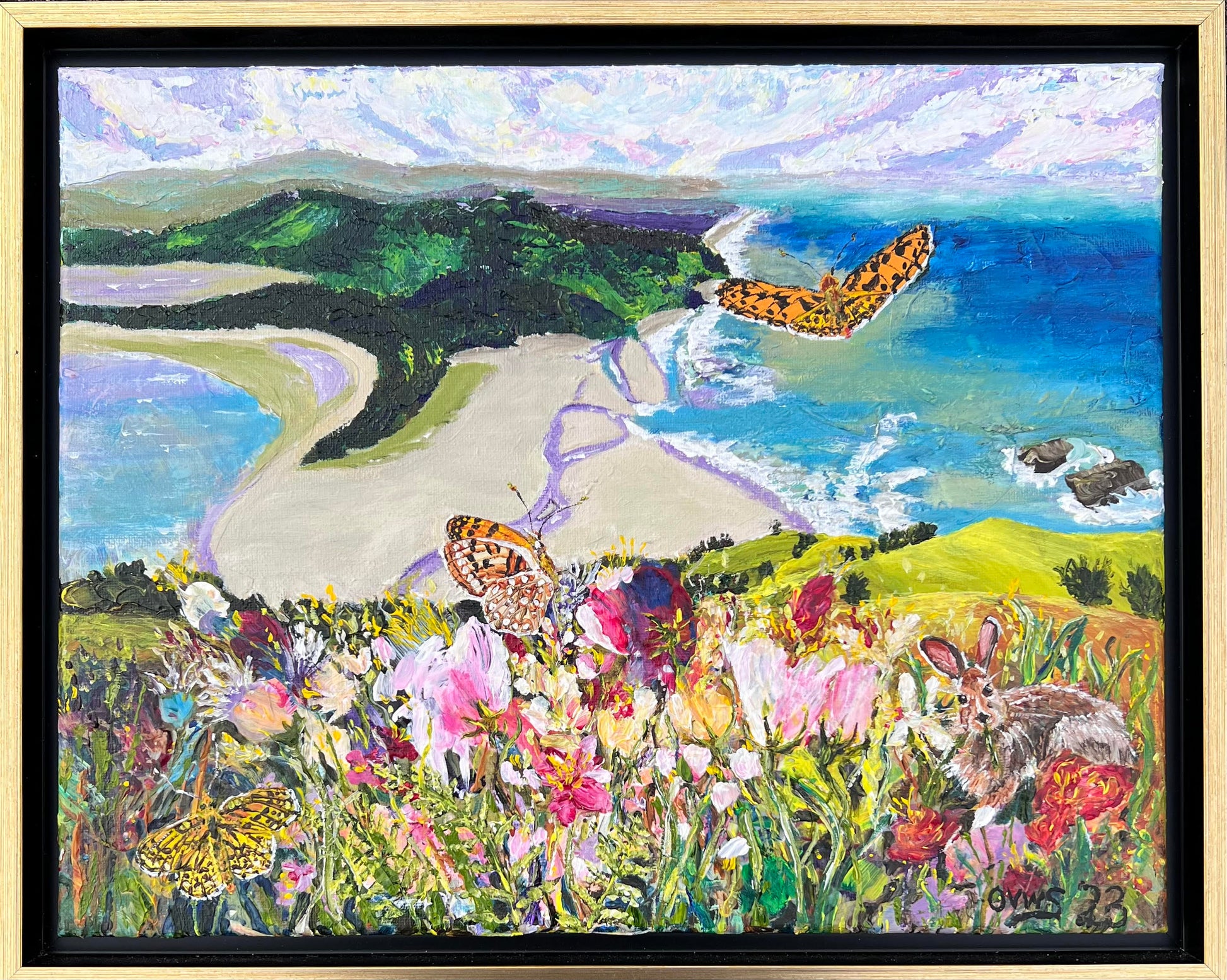 over to make butterflies “pop.” Cascade Head UNESCO Biosphere Reserve is home to the endangered Oregon silver spot butterfly and snowshoe hare, both of which are depicted in this painting.
