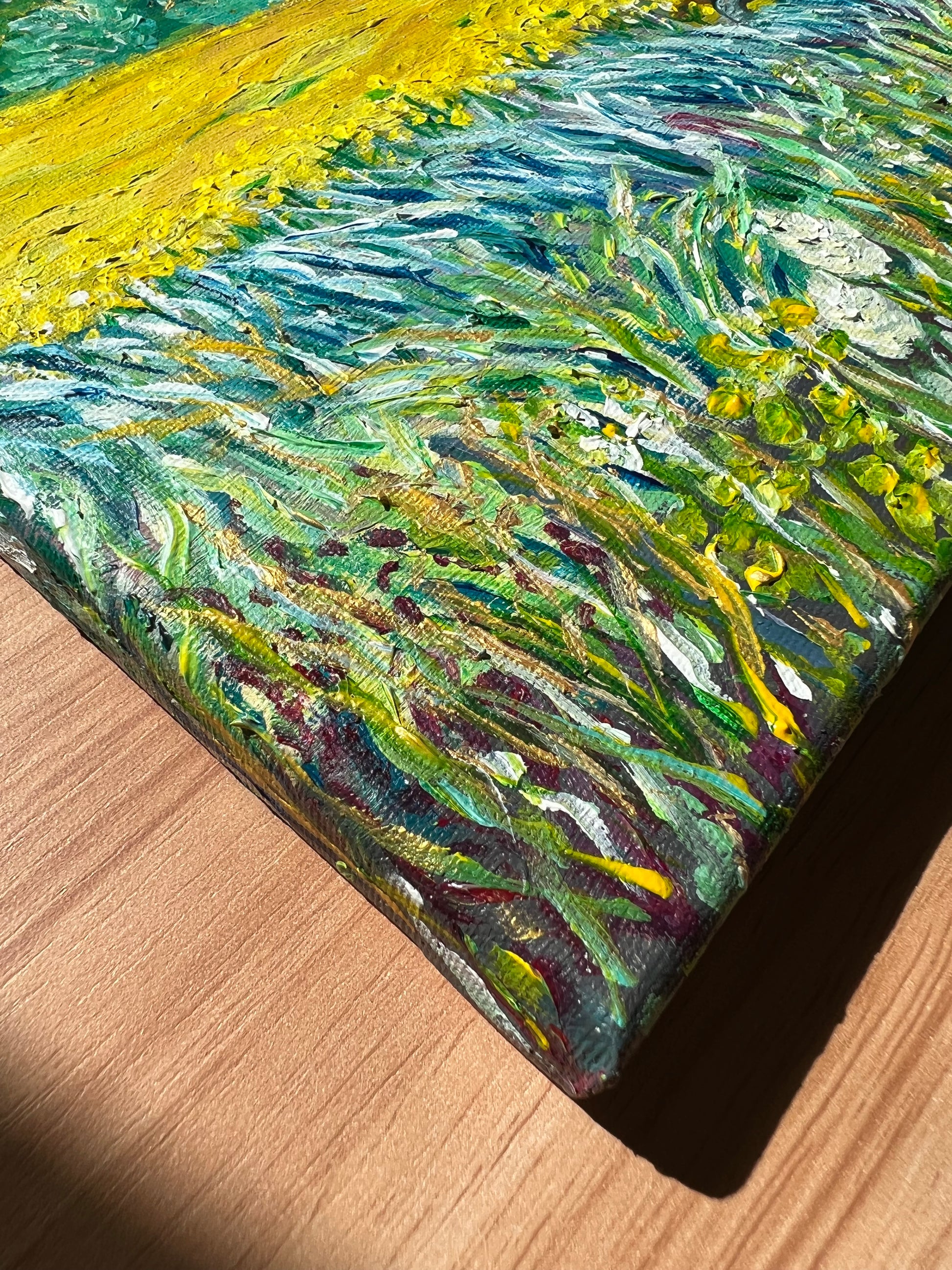 Just before the corner where Highway 51 meets Highway 22, this green tractor sat basking in a sea of yellow rapeseed flowers. This magical glimpse of nature is captured in this colorful acrylic painting rendered in thick brush strokes and lavish color. Blue grass bends in the breeze as yellow flowers toss their heads under deep blue skies, and all is ashimmer with touches of sparkling gold paint. Oregon is a dream. Magic Realism